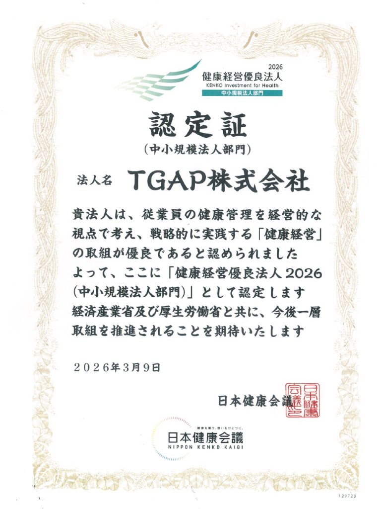 TGAP株式会社は、経済産業省が推進する「健康経営優良法人認定制度」において 「健康経営優良法人2026」として認定されました。